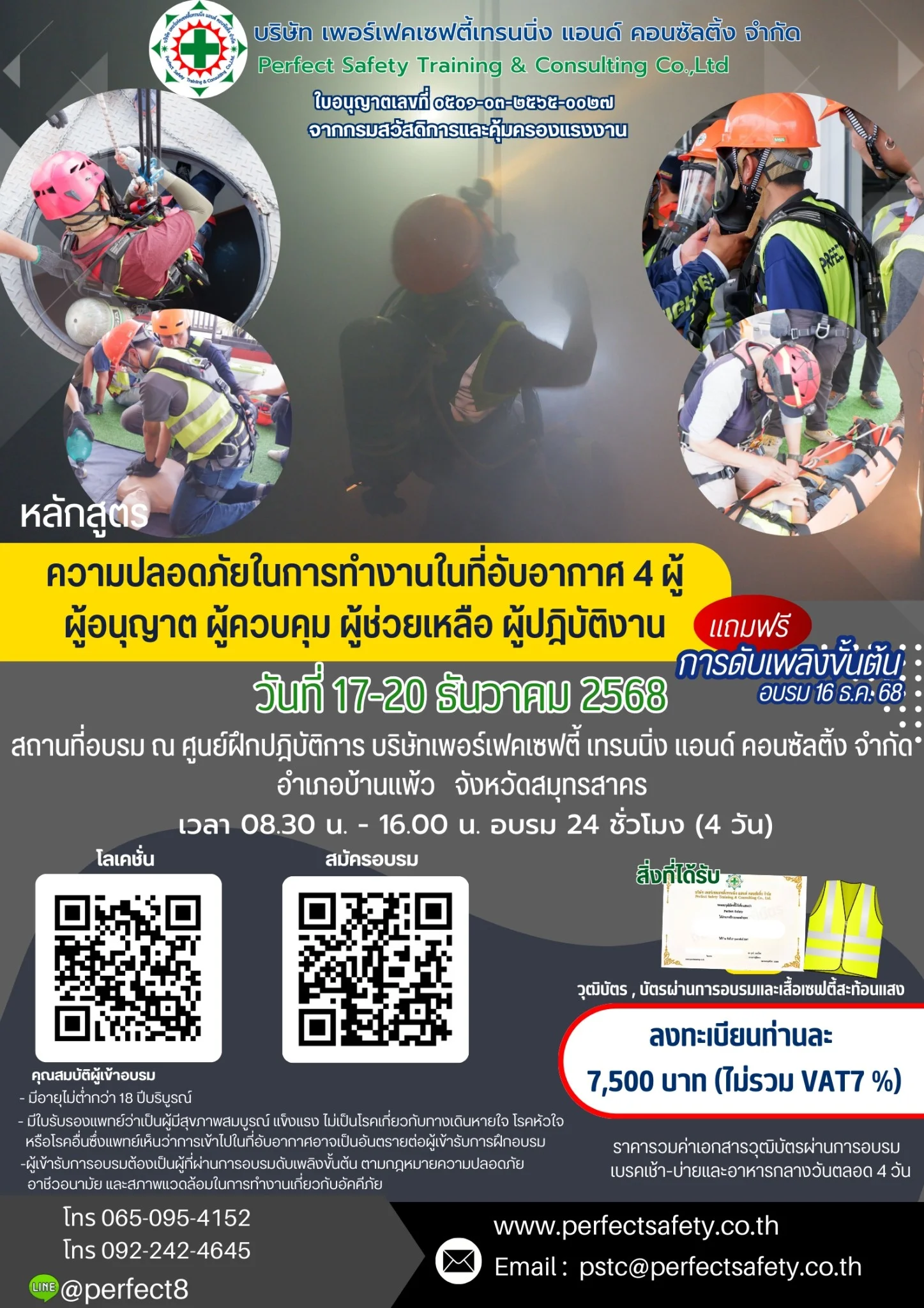 หลักสูตรความปลอดภัยในการทำงานในที่อับอากาศ 4 ผู้ วันที่ 17-20 ธ.ค. 2568 ณ ศูนย์ฝึกปฏิบัติการฯ จ.สมุทรสาคร