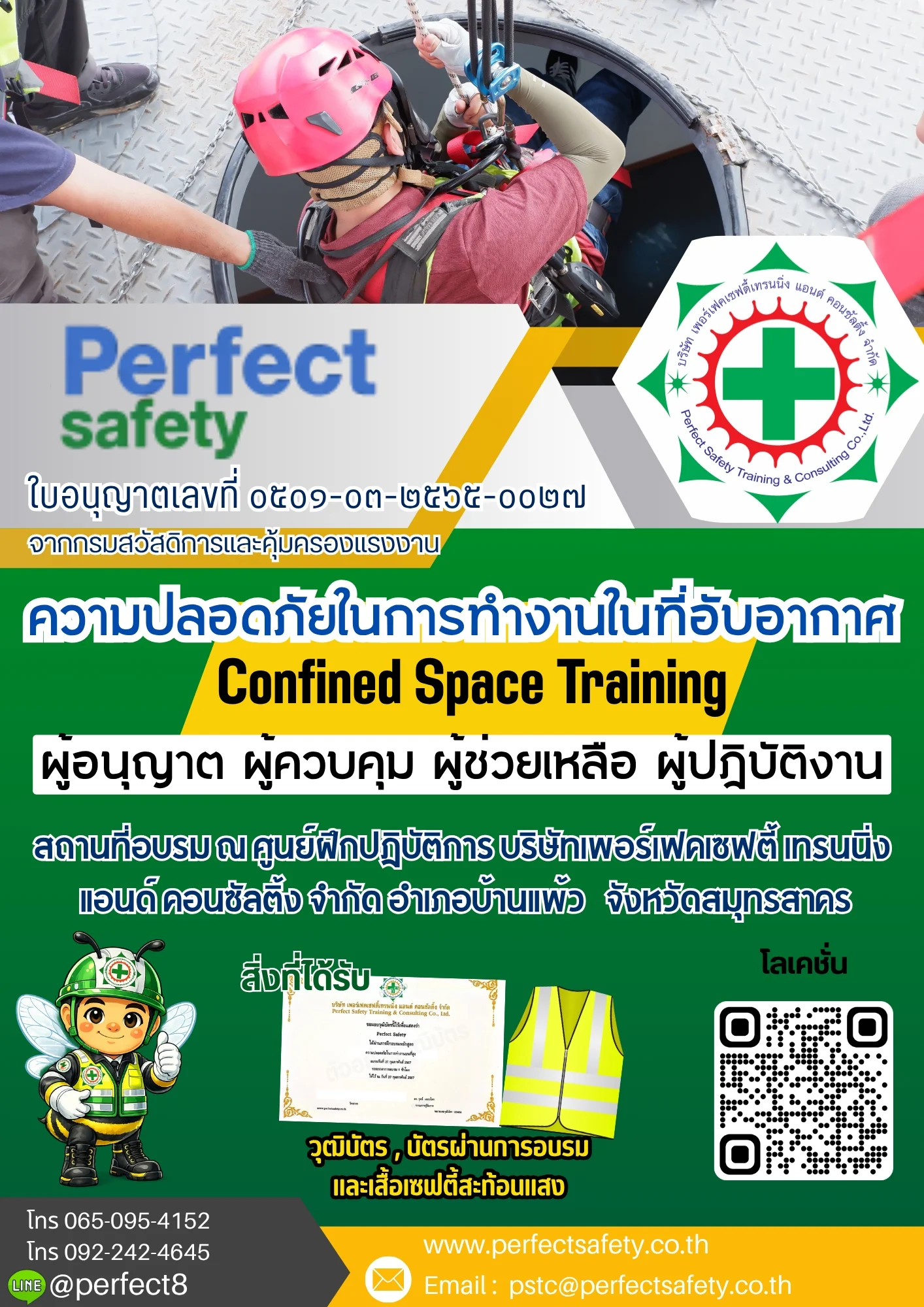 หลักสูตรความปลอดภัยในการทำงานในที่อับอากาศ ณ ศูนย์ฝึกปฎิบัตรการ บริษัทเพอร์เฟคเซฟตี้เทรนนิ่ง แอนด์ คอนซัลติ้ง จำกัด อำเภอบ้านแพ้ว จังหวัดสมุทรสาคร