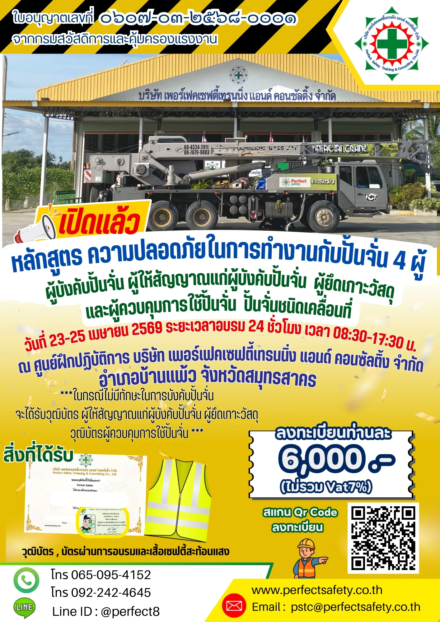 หลักสูตรความปลอดภัยในการทำงานกับปั้นจั่น 4 ผู้ วันที่ 23-25 เมษายน 2569 ณ ศูนย์ฝึกปฎิบัตรการ บริษัทเพอร์เฟคเซฟตี้เทรนนิ่ง แอนด์ คอนซัลติ้ง จำกัด อำเภอบ้านแพ้ว จังหวัดสมุทรสาคร