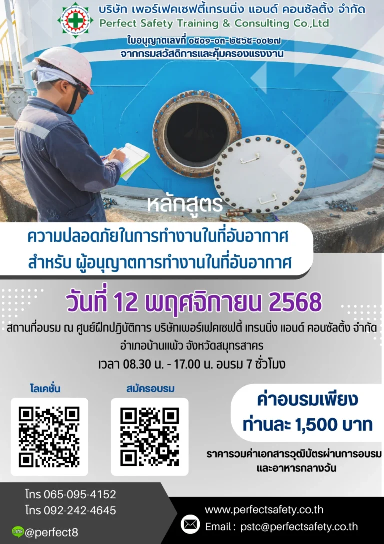 หลักสูตรความปลอดภัยในการทำงานในที่อับอากาศ สำหรับผู้ปฏิบัติงานในที่อับอากาศ ณ ศูนย์ฝึกปฏิบัติการฯ จ.สมุทรสาคร November 4, 2025