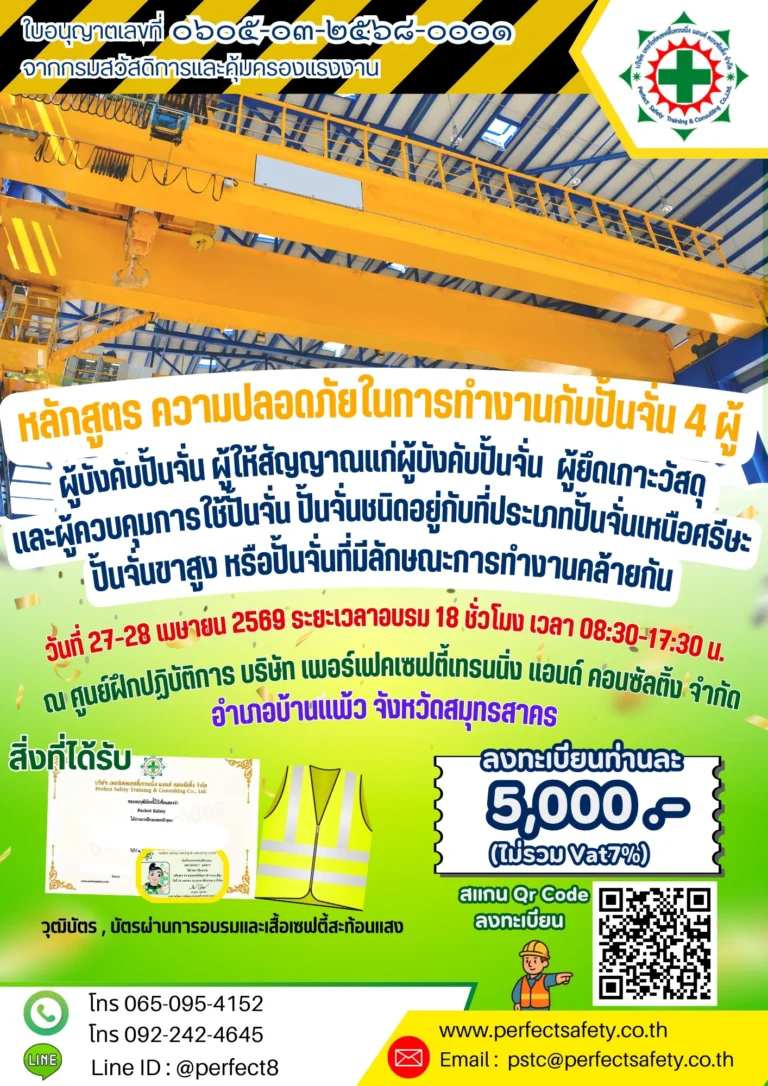 หลักสูตรความปลอดภัยในการทำงานกับปั้นจั่น 4 ผู้ วันที่ 23-25 เมษายน 2569 ณ ศูนย์ฝึกปฎิบัตรการ บริษัทเพอร์เฟคเซฟตี้เทรนนิ่ง แอนด์ คอนซัลติ้ง จำกัด อำเภอบ้านแพ้ว จังหวัดสมุทรสาคร